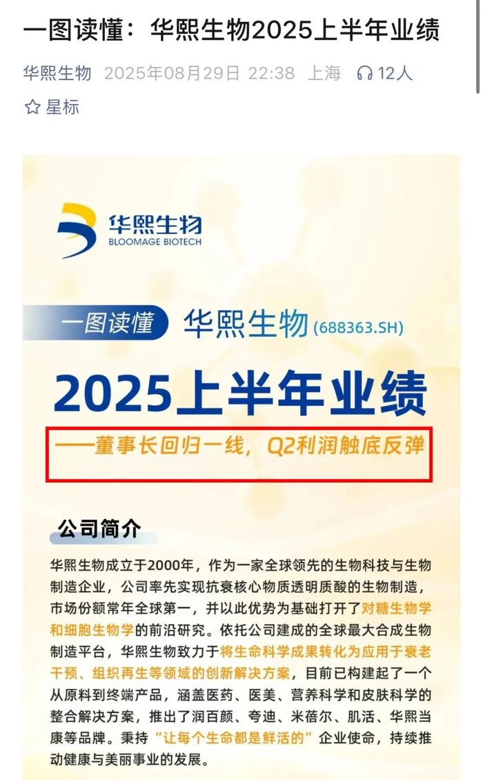 从公司2025半年报来看,这些举措似乎已经逐渐收获成效。8月29日晚间,华熙生物还在公众号发布《一图读懂:华熙生物2025上半年业绩》的文章,声称“董事长回归一线,Q2利润触底反弹”。