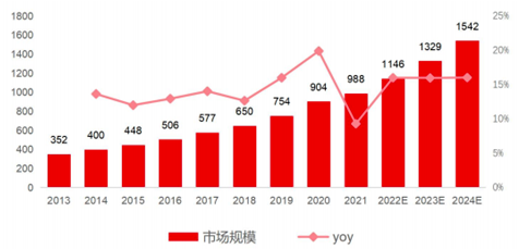 2013-2024年中国光瓶酒行业市场规模及增速(资料来源:华经产业研究院,方正证券研究所)