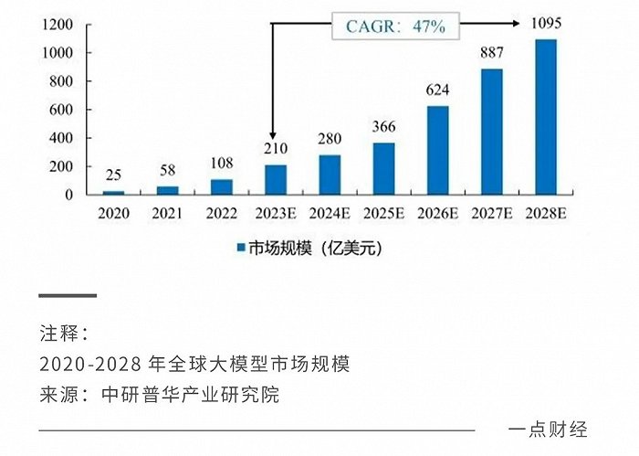 ChatGPT的横空出世,拉开AI大模型的全球竞速,热钱迅速涌来,也催生出巨大的市场空间。中研普华产业研究院数据显示,2024年全球大模型市场规模将达到280亿美元,并在2028年形成千亿美金的巨大蛋糕。