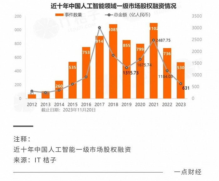 不过,国产大模型的投资力度,并没有跟发布数量一样,呈大幅上升的趋势。IT桔子数据显示,2021年~2023年,中国AI领域一级市场的股权融资的数量和金融都呈下降趋势,大模型的投资也没有呈大幅上升的迹象。