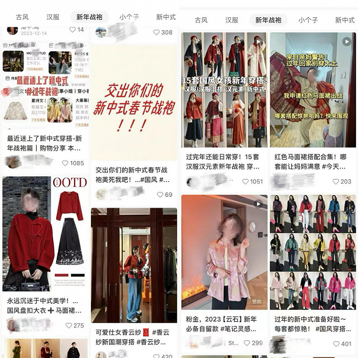 在社交平台,国风服装也越来越受到年轻人的喜爱,不管在小红书还是其他短视频平台,各种国风穿搭随处可见。
