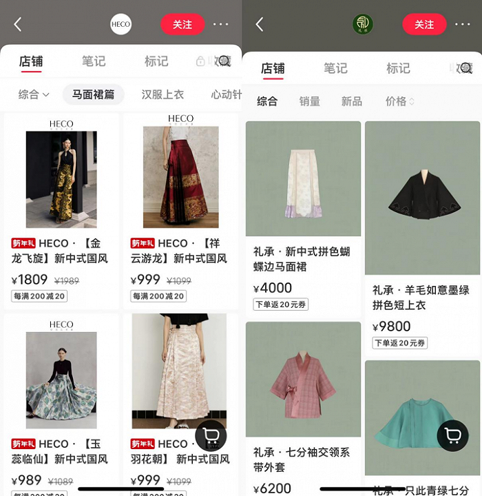 搜索淘宝发现,500-1000元区间的马面裙产品超过4000件;1000-2000元区间的马面裙商品近2900件;而在小红书平台,诸如HECO、清风集、礼承等定价千元以上的品牌也有很多。