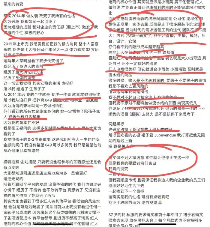 回看张大奕所在公司如涵控股在战略上也经历了想转不敢转平台的阶段。早期以张大奕为核心的如涵集团其实有点儿像一个网红孵化MCN公司,通过培养中腰部网红形成自营网红电商平台。那时候如涵集团或许对网红电商的期待是,网红通过个人IP的影响力,向她的粉丝销售商品,理论上每一个网红都可以拥有起码一家自营店。