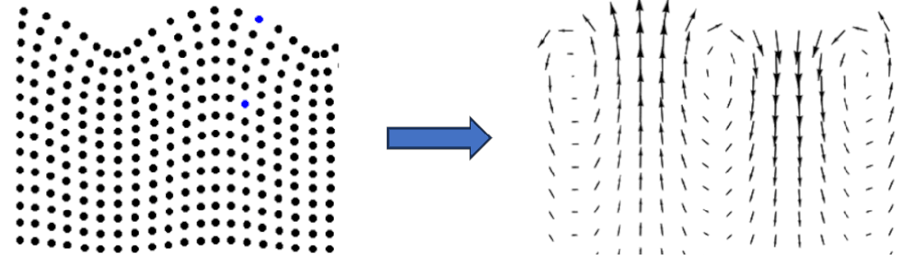 图3 固体中的瑞利波;左图为质点图像,右图为位移场图像。