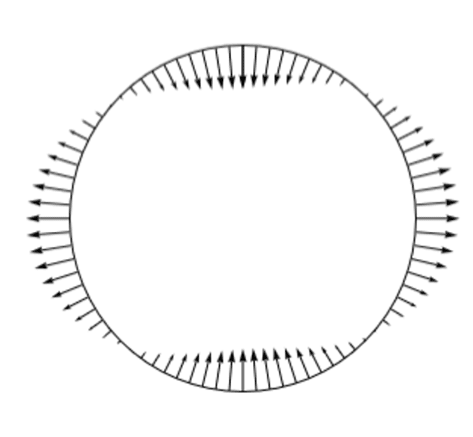 此时,整个圆环的振动状态在“转圈”,但每一个黑色箭头都没有改变方向,只是在改变大小。这意味着质量微元的运动总是“直来直去”的,单独观察圆环上某一个固定位置的振动就可以发现,质量微元自己并没有在转圈,即自旋角动量密度为零(每一个质量微元自己并没有圆极化的振动),但是轨道角动量密度不为零——质量微元的振动状态(或能流)在沿着逆时针方向传播。那么,如果圆环上的振动模式并不沿着圆环传播,是不是就没有轨道角动量了?是的,就像图6所示的圆环,它整体的轨道角动量就是零。