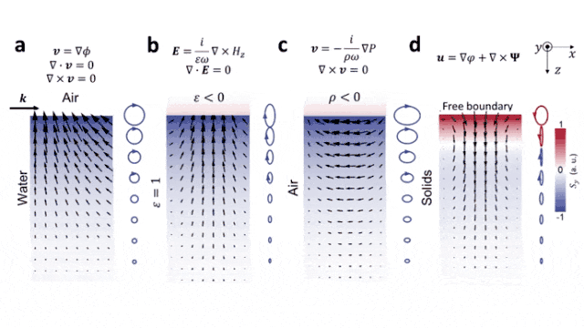 图7 a-d分别对应着表面水波、表面电磁波、表面空气声波和瑞利波。颜色图的蓝色表示自旋角动量密度方向垂直纸面向内(负),红色代表方向垂直纸面向外(正);黑色箭头代表矢量场的大小和方向,其对应的椭圆极化方向在右侧画出。显然,最右侧的弹性波表面波与前三个系统在自旋分布上有显著差异。