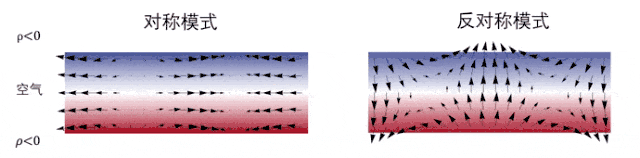 图9 空气声波的对称模式和反对称模式。黑色箭头表示速度场。此处对称和反对称模式上下表面自旋密度的方向相同。
