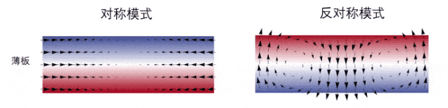 图10 弹性板波(兰姆波)的对称模式和反对称模式。黑色箭头表示位移场。可以看出,与电磁波和空气声波的导波模式不同,兰姆波的对称和反对称模式上下表面自旋密度的方向相反。
