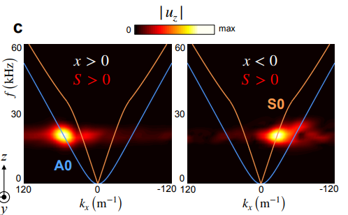 图13:实验测量结果,信号由S>0的手性源激励。在源左侧(x<0),弹性波的信号在A0模式的色散曲线上,表明该信号为A0模式;源右侧(x>0)的信号为S0模式。这表明实验测量结果与图12中的预期相符。