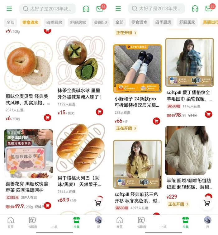 然而,这次逛一圈下来,我发现豆瓣的选品早已“亲民”许多:贝果、柿饼、棉服、日程本、中性笔……而每个商品下面,都显示着几百到几万不等的在逛人数,一些热销商品,甚至能够达到几十万。