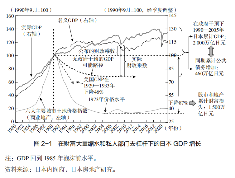 辜朝明经过测算,发现1989年后的资产价格暴跌让日本损失了1500万亿日元的财富,而造成的缺口又让企业和家庭进行了至少15年的净债务偿还,这种资产负债表衰退进而消灭了相当于GDP总额20%的总需求,彻底将日本拖进了萧条的泥潭。