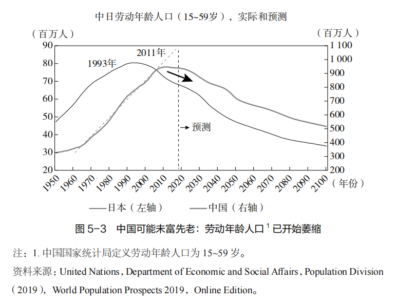 中国的人均GDP略高于10000美元,目前处于陷阱的中间位置(见图5-2),而其劳动年龄人口从2012年开始萎缩(见图5-3)。2020年的人口普查数据表明,中国总人口可能最早在2022年开始萎缩。因此经济学家担心,中国在完全摆脱中等收入陷阱并加入发达经济体行列前,会因为不利的人口结构而失去增长动力。