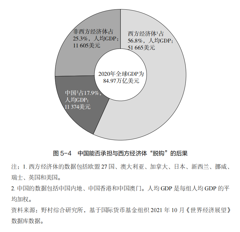 与西方市场“脱钩”意味着中国企业可能不得不向那些不富有的地区销售。如图5-4所示,西方经济体(包括日本)占全球GDP的56.8%,而俄罗斯、非洲和其他地区仅占25.3%(中国占17.9%)。