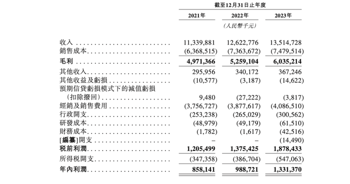 招股书显示,2021-2023年,华润饮料的收入分别约为113.40亿、126.23亿、135.15亿元;毛利分别约为49.71亿、52.59亿、60.35亿元;年内利润分别约为8.58亿、9.89亿、13.31亿元。
