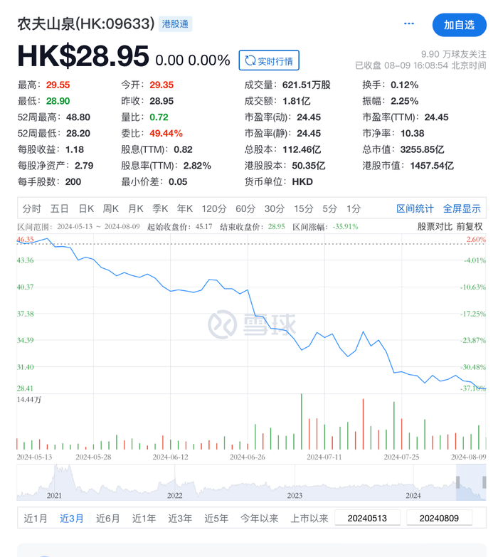 此前有消息人士称,华润集团对于华润饮料的估值目标高达60亿美元,但潜在投资者寻求低于这一水平的估值。这,或许是因其竞争对手农夫山泉的股价近三月来已累计下跌约37%,截至发稿,后者总市值约3255.85亿港元。