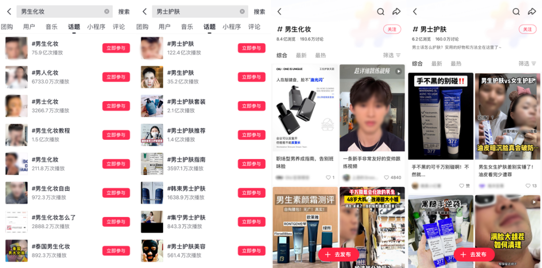 抖音上,“男士护肤”话题视频高达122.4亿播放量,“男生化妆”话题视频高达75.9亿播放量。而在小红书,“男生化妆”“男士护肤”等话题讨论度均突破百万。这说明,男士美妆正从“小众选用”走向“大众日常”。
