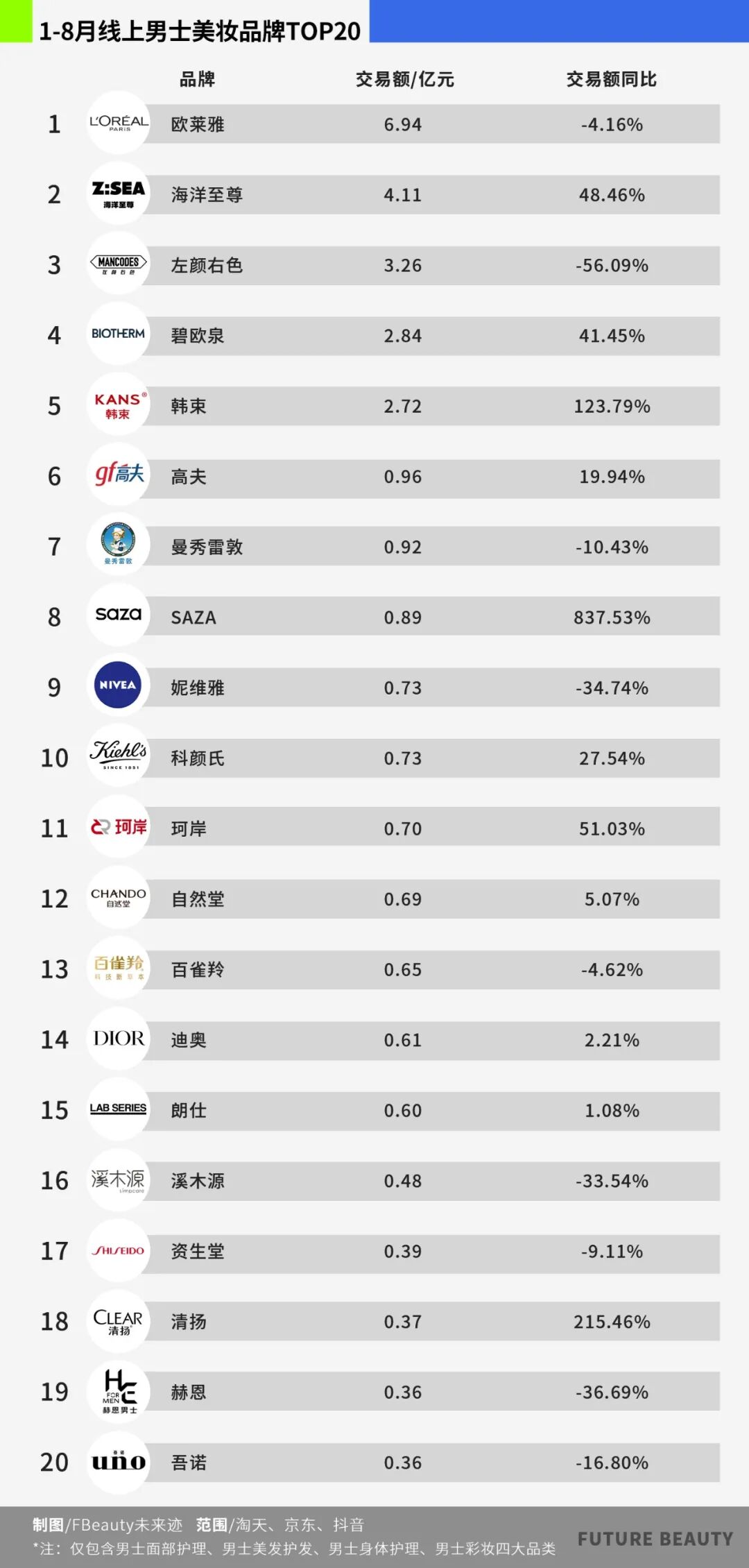 分析这份TOP20榜单,可以发现,目前男士美妆赛道大致分为两大“势力”。