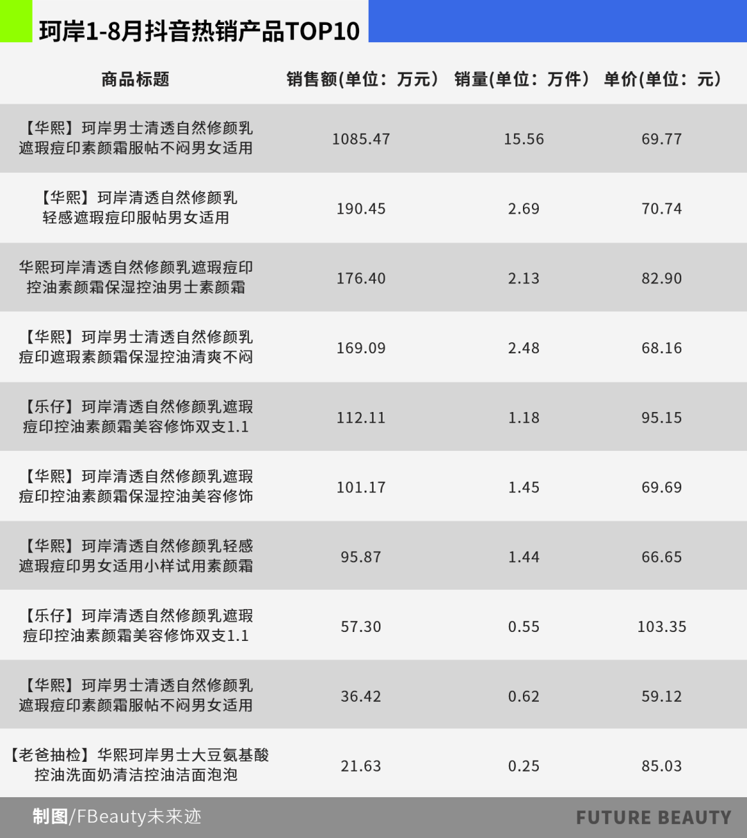 1-8月交易额实现51.03%增长的珂岸,就凭借素颜霜产品实现突围。其专为亚洲男性设计,主打自然提亮、保湿遮瑕等,受到了男大学生等年轻群体的欢迎。