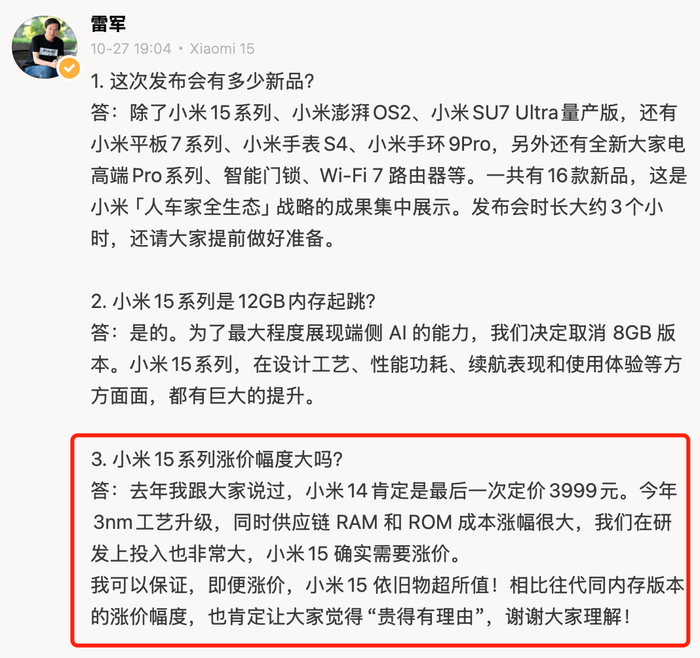 比如雷军称“小米15确实需要涨价”,原因是今年元器件成本上涨非常多,小米的研发投入也非常大。