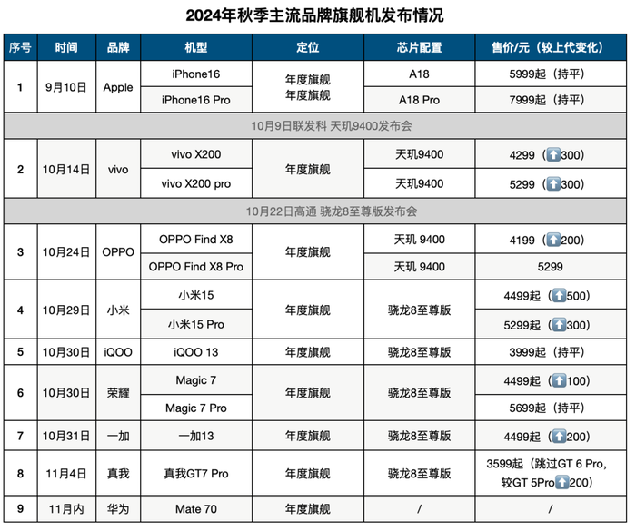 在半个月的喧嚣之后,11月初2024年秋季的智能手机发新季步入了尾声。 除了华为Mate系列新品尚未亮出真容,小米、OPPO、vivo等各大主流品牌的2024旗舰新品,都已列队集齐。
