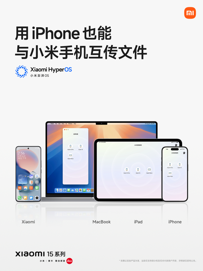 如小米15号称可全面支持苹果生态,支持与Macbook、iPad、iPhone互传文件、与Macbook镜像投屏、支持苹果办公套件等,同时在外观上也对齐了苹果的冷雕玻璃背板工艺。