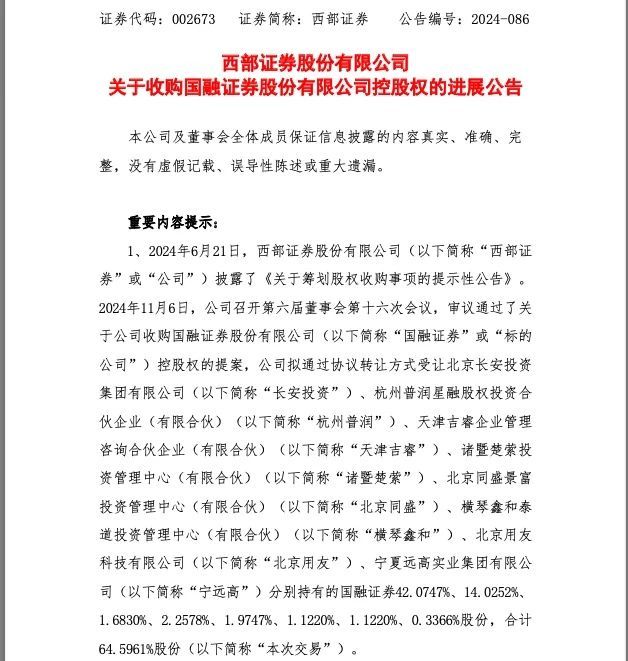 而今年6月21日,西部证券就已公告称,正在筹划以支付现金方式收购国融证券控股权事项。