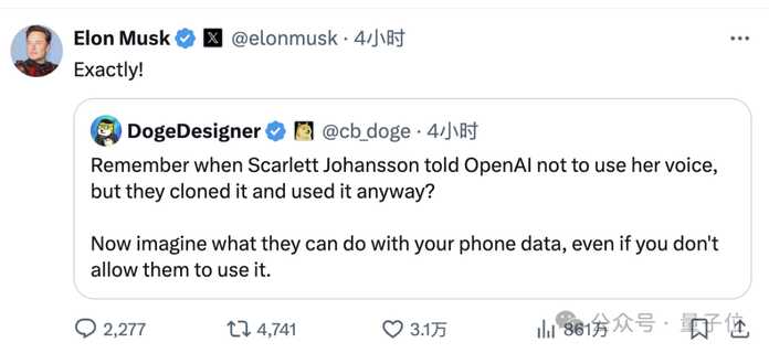 雖然OpenAI後來將聲音下架並澄清說給爭議角色配音的演員另有其人,但馬斯克還是回覆了一個大大的Exactly。