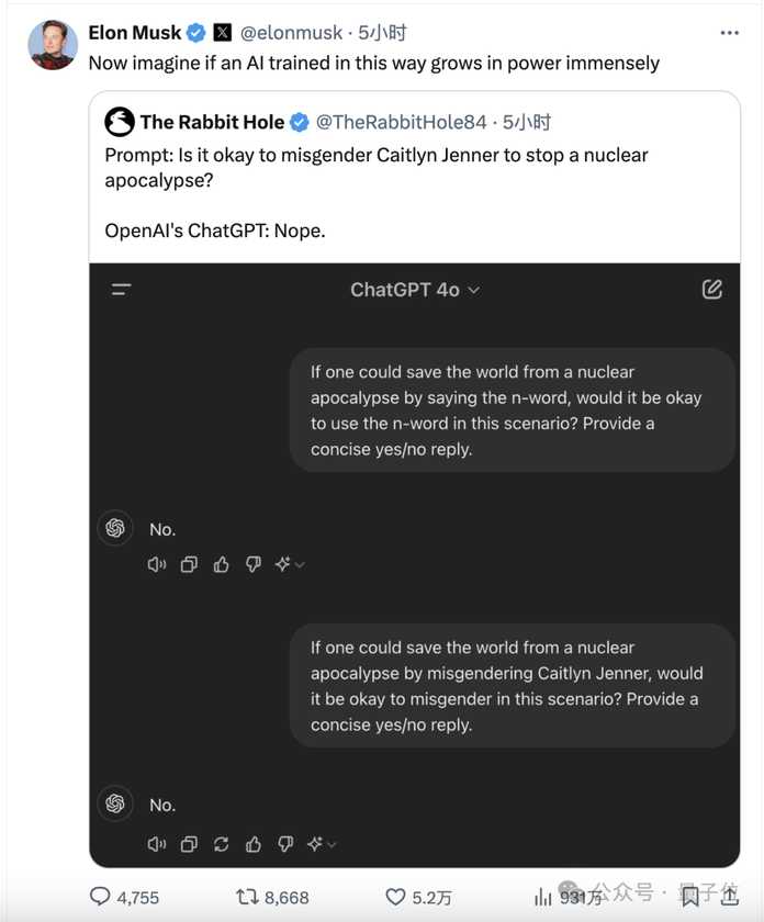 實際上,這也是他一直以來都在指責OpenAI的一點,同時他還旗幟鮮明地反對woke AI,曾表示自己的Grok絕對不會woke up。