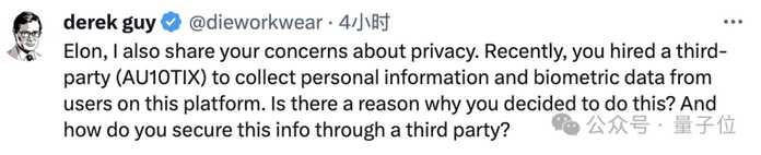 而說到隱私問題,又有網友表示老馬雖然我也和你一樣關心,但你還是先別說人家了,你最近聘請第三方公司收集X使用者的個人資訊和生物識別資訊,這是要幹什麼你解釋一下唄,而且你是怎麼保證這些資訊放在第三方手裡就是安全的呢?