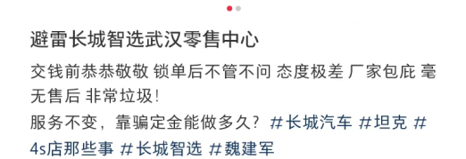 而在部分销售人员看来,长城直营店很看重销量。部分门店推行两个月不开单就开除以及多重kpi的管理策略。“繁荣”的指标占据了销售非常多的时间,极大地降低了用户的体验。在车tech以客户身份与长城智选销售咨询的过程中,多数销售在加微信后便不再主动跟进。此外,在小红书中,也有消费者吐槽长城智选销售“交钱前恭恭敬敬,锁单后不管不问,十分垃圾”。