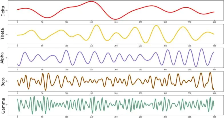 就像乐曲有高低不同的音调,神经振荡也有快慢不等的频率。根据频率的不同,研究人员将其划分为δ(1-4Hz)、θ(4-8Hz)、α(8-12Hz)、β(12-30Hz)和γ(30-100Hz)等频段。每个频段的振荡都与特定的脑功能相关。例如,α波出现在清醒放松时,而γ波则参与感知、记忆、注意等高级认知活动。