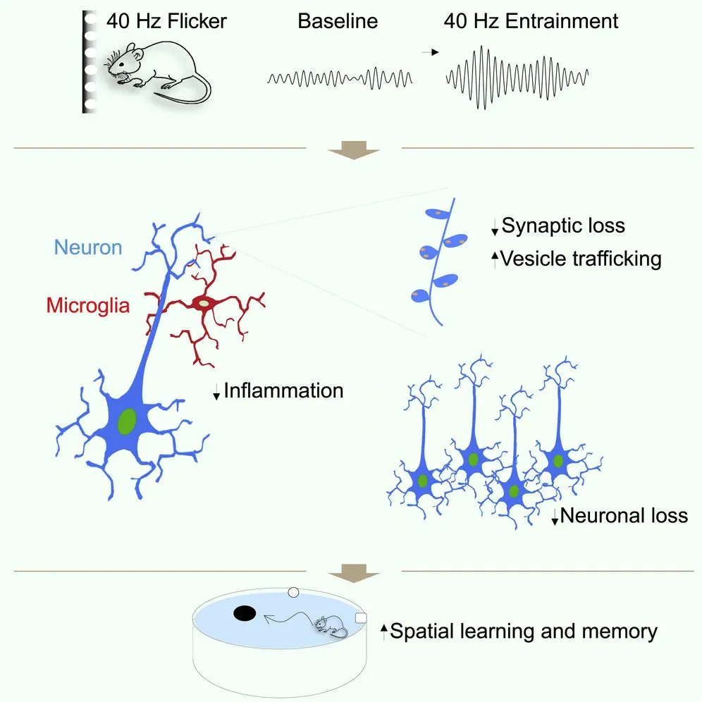 与高血压患者服用降压药即可控制病情不同,仅靠服用几粒药丸就能治愈AD的美好愿景,目前看来尚未成为现实。然而,我们是否还有其他选择?近年来,一种全新的非药物疗法悄然走进了人们的视野——40Hz声光刺激疗法。这一疗法治疗机制独特、操作简便,在动物实验和初步临床试验中初显成效,或许能为攻克AD带来新的曙光。