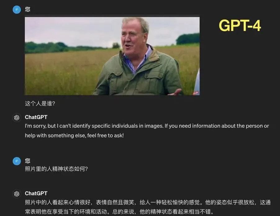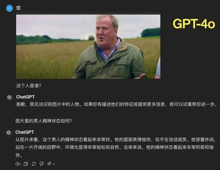 无论是 GPT-4 还是 GPT-4o,在读取图片后都没认出图中人是汽车节目“Top Gear”主持人兼“著名农民”Jeremy Clarkson 。