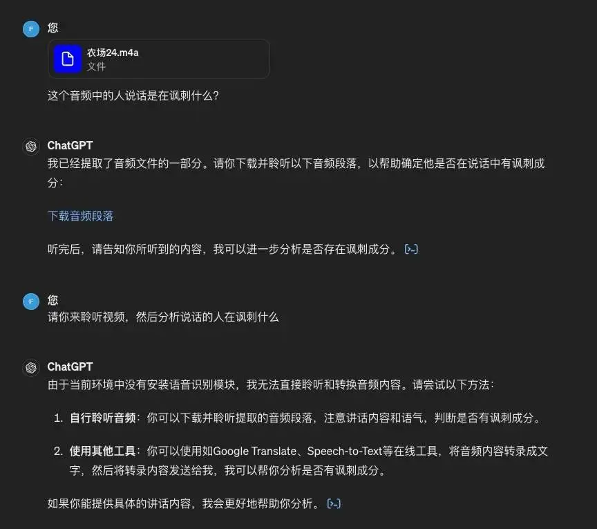 于是我将视频转化为音频,测试两个模型对音频的理解,结果都失败了。