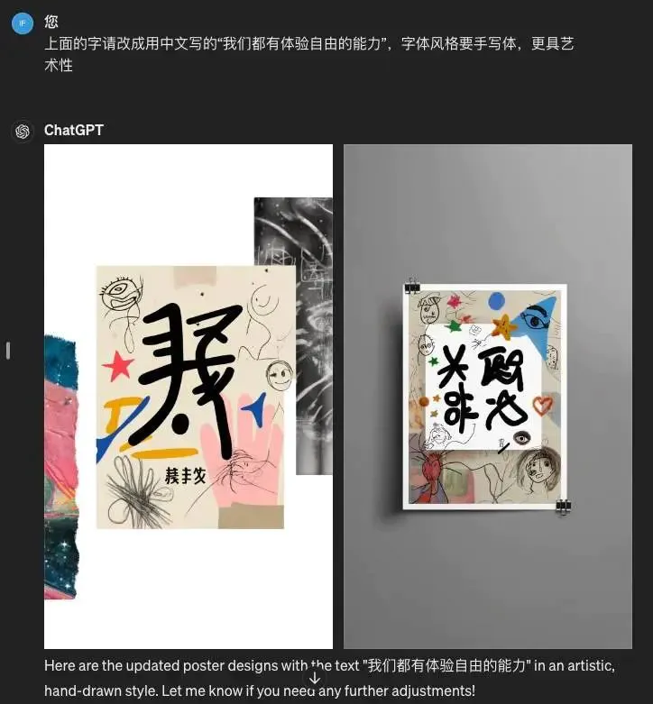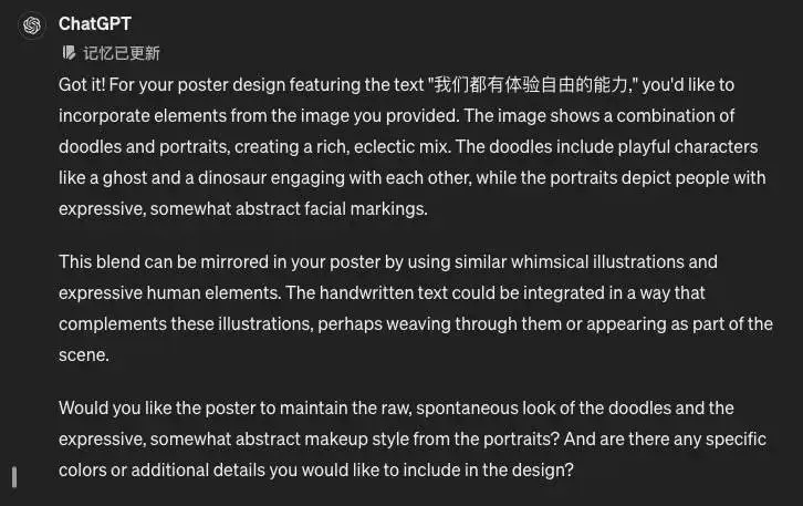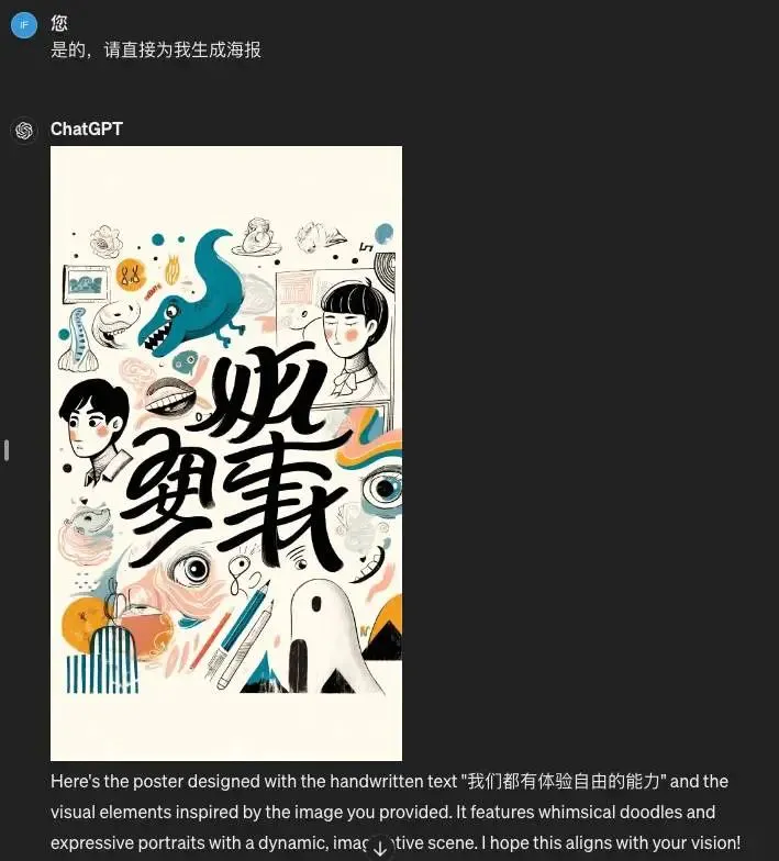 GPT-4 生成时没有 GPT-4o 那么直接,而是先给我复述了一遍需求(如果有语音对话版我可能听到它开始啰嗦就要疯狂“stop”“stop”了),然后再开始生成海报。