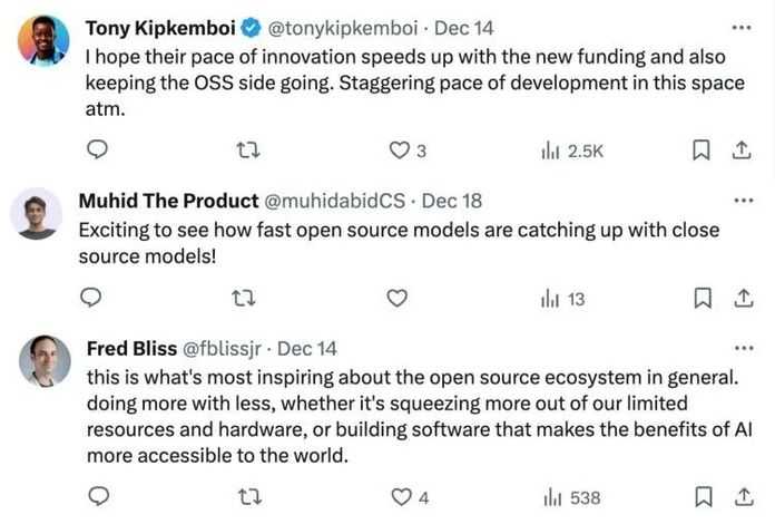 這種開源共享精神,也自然在如今AI行業巨頭壟斷、小公司掙扎求生存的時代背景下,獲得廣大開發者的擁戴。人們表達著見證開源模型迅速趕上閉源模型的興奮,認為「用更少做更多」正是開源生態系統最鼓舞人心的地方,並希望Mistral AI能隨著新資金的注入加速開源領域創新。