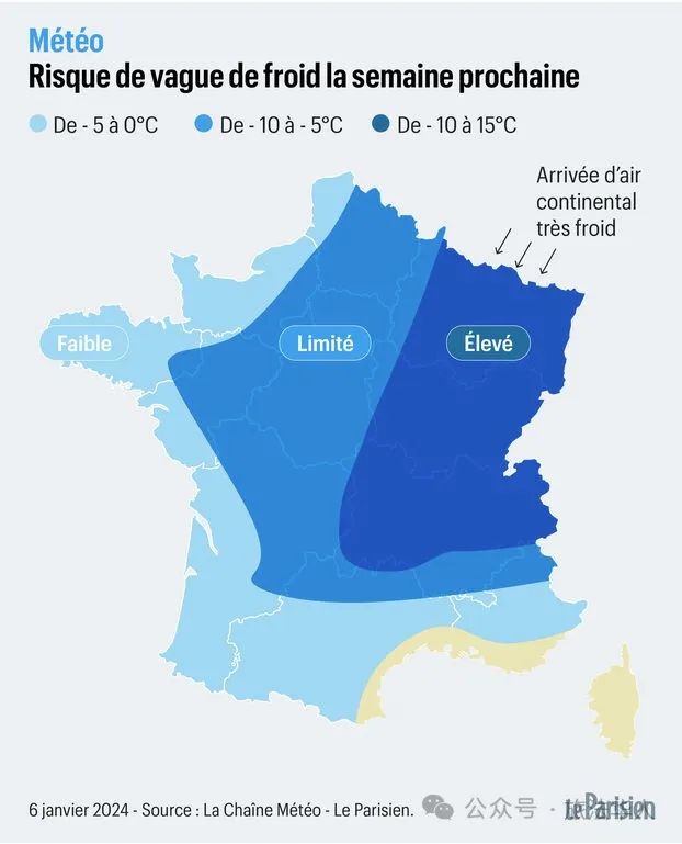 下周初,寒流袭击法国,未来几天将迎来大幅降温,东部地区受影响最严重。法国气象局(Météo France)甚至预计,9日星期二将是六年来最冷的一天,“星期二,全国温度指标可能会降至0摄氏度以下,这已经近六年(自2018年2月以来)没有发生过了。”