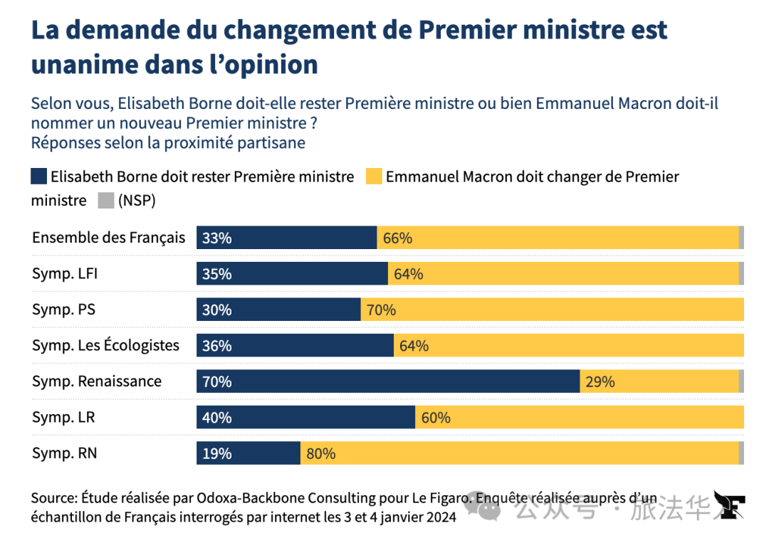 具体来说,法国几乎所有政治派别的选民普遍希望看到伊丽莎白·博尔内下台,在极右翼“国民联盟”选民中达80%,在左翼社会党选民中达70%,在极左翼“法兰西不屈服”选民中达64%,在右翼共和党选民中达60%,只有在执政党复兴党选民中占少数,比例为29%。