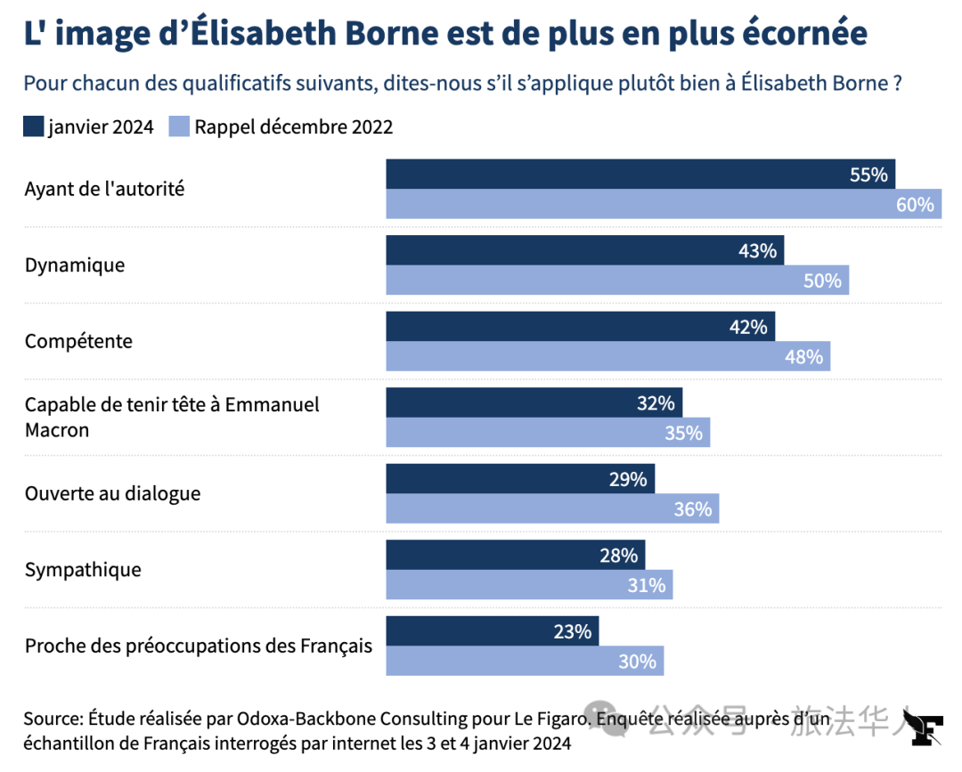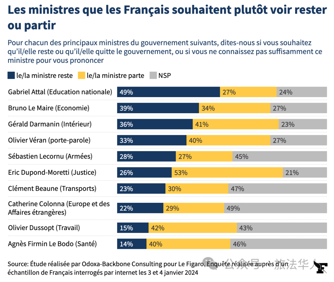 在法国内阁成员中,伊丽莎白·博尔内并非唯一受到诟病的人,也有一些部长受到指责。例如,53%的法国人希望司法部长埃里克·杜邦-莫雷蒂(Éric Dupond-Moretti)下台,42%的法国人希望劳工部长奥利维耶·杜索普(Olivier Dussopt)下台,41%的法国人希望内政部长杰拉德·达尔马南(Gérald Darmanin)下台。在10名主要部长当中,在法国人眼中只有三人似乎比较称职:49%的法国人支持教育部长加布里埃尔·阿塔尔(Gabriel Attal)留任,只有27%的法国人希望他下台;39%的法国人支持经济部长布鲁诺·勒梅尔(Bruno Le Maire)留任,34%的法国人希望他下台;28%的法国人支持国防部长塞巴斯蒂安·勒科努(Sébastien Lecornu)留任,27%希望他下台。