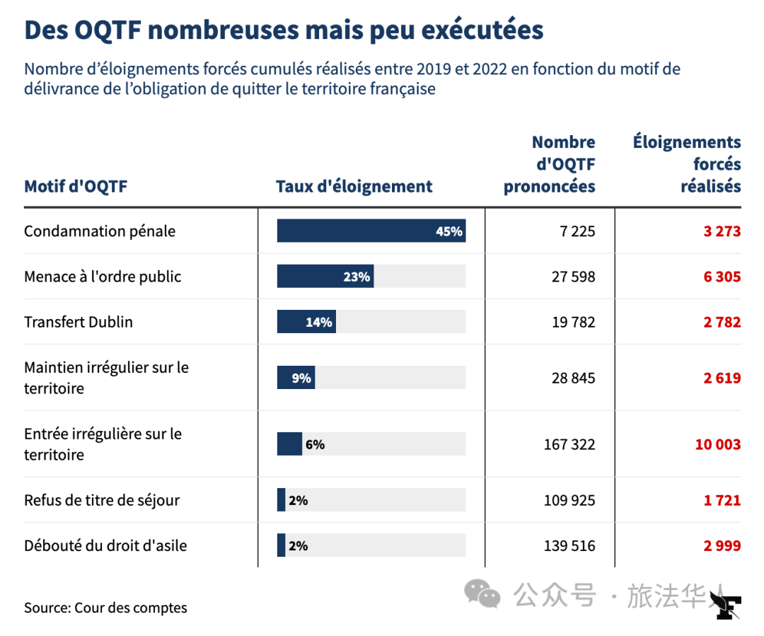 根据法国内政部的说法,这些数字包括签发强制离境通知(OQTF)和部长驱逐令(AME)所实际被驱逐的人员,不包括登记在法国“预防恐怖主义性质极端化行动监视档案”(FSPRT)而被驱逐的人。