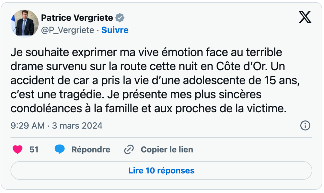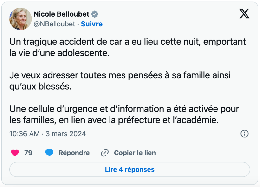 悲剧发生后,交通部长帕特里斯·维格里特(Patrice Vergriete)向年轻受害者的家人表示了“最诚挚的慰问”。教育部长妮科尔·贝鲁贝(Nicole Belloubet)也在社交平台X上表达了同样的慰问。