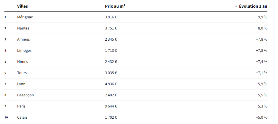 在下跌幅度方面,法国各地存在着较大的差异。Meilleurs Agents 公司为《费加罗报》进行了一项调查,为法国人口排名前 50 的城市的房价跌幅进行了排名,其中跌幅最高的是吉伦特省的梅里尼亚克市,跌幅高达 10%。跌幅最低的是滨海塞纳省的勒阿弗尔市,这里的房间不降反升,涨幅高达 15%。