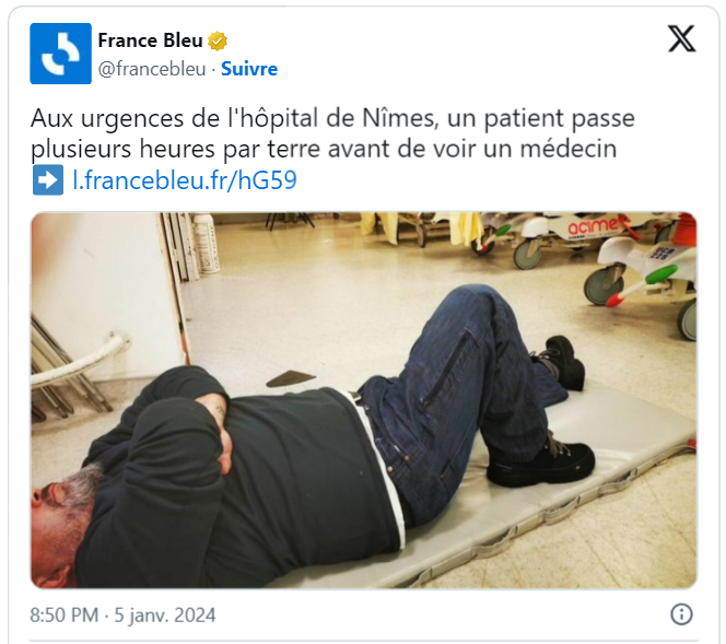 1月四日星期四,一名因背部疼痛前往急诊的男子由于医院人满为患无法接受 X 光检查,足足在地板上躺了好几个小时。这名五十多岁的男子因背部疼痛被消防队送到急诊室。在病房里等了很久之后,抬他来的担架被腾出来给其他病人使用,因此男人不得不在地上躺了好几个小时。