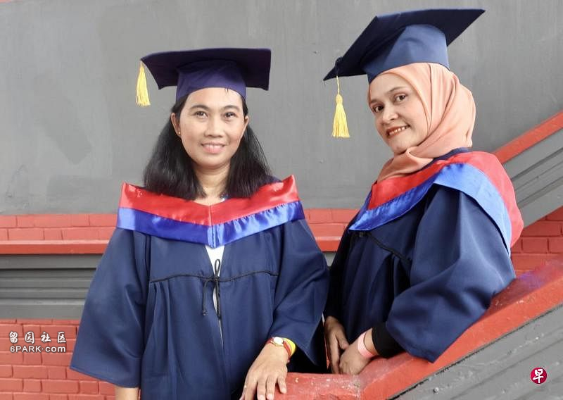 玛雅(左)和阿丽法顺利完成年长者综合护理培训项目,并于结业典礼穿上毕业袍,领取年长者护理专业证书。(邬福梁摄)