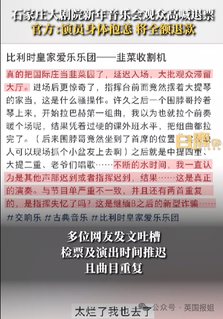 原本顶着零下十几度的寒风,打算听一场比利时爱乐乐团演出的观众,最终却被一众草台班子的乐手敷衍了事,这样的哑巴亏谁能咽的下。