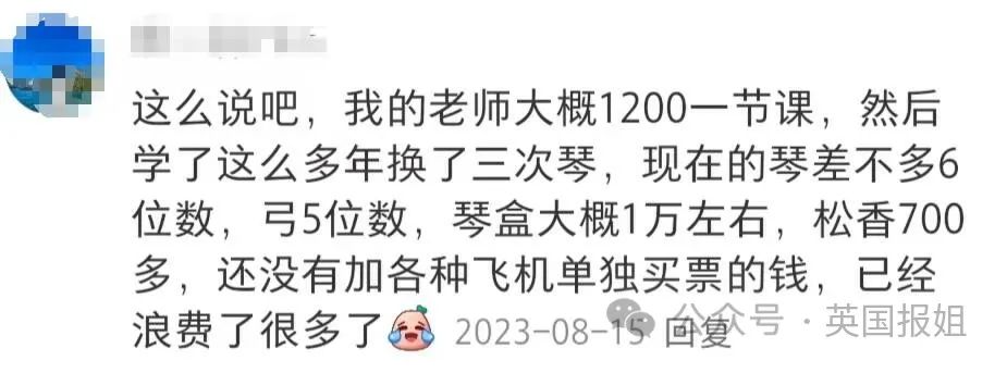 除了动辄几万甚至十万的乐器、琴弦等必须付费的部分外,几百几千一节的乐器课程,以及几万一期的大师课和各类乐团的音乐会门票费用才是后面源源不断的大额开支。