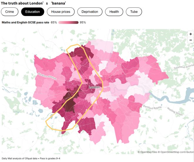 然后是教育,香蕉区内的孩子们,似乎也享受着更优质的教育资源。2024年英国资格与考试监管局数据的分析显示,数学和英语GCSE成绩最好的学校同样在香蕉区内——位于伦敦西南部的里士满(Richmond Park)。