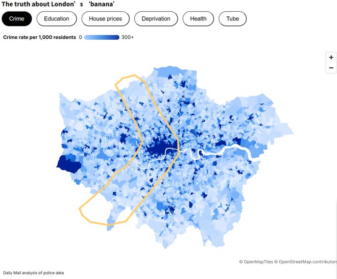 不过香蕉区也并不是十全十美的存在。因为覆盖了人口往来密度最大的几个区域,所以部分地区如威斯敏斯特、伦敦金融城、南华克和卡姆登等行政区的犯罪率也相对较高。不过香蕉区域的北部和南部,如巴尼特和里士满这些地区的犯罪率都比邻近地区要更低。