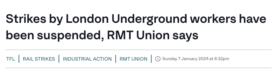 铁路,海事和运输工会 (RMT) 的成员原定于周一至周五(1月8日—1月12日)进行罢工。不过由于RMT与伦敦交通局的谈判取得进展,该工会宣布暂停原罢工计划。