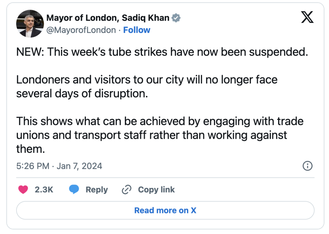 据了解,此次罢工之所以能够暂停,主要由于伦敦市长萨迪克·汗的直接干预,承诺为地铁工人提供更多资金。据了解,此次罢工之所以能够暂停,是因为伦敦市长萨迪克·汗进行直接干预,承诺为地铁工人提供更多资金。